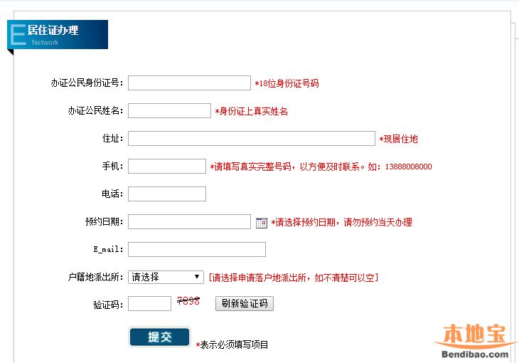 所需填寫的信息包含:辦證公民身份證號、辦證公民姓名、住址、手機(jī)、電話、預(yù)約日期、E_mail、戶籍地派出所、驗(yàn)證碼;