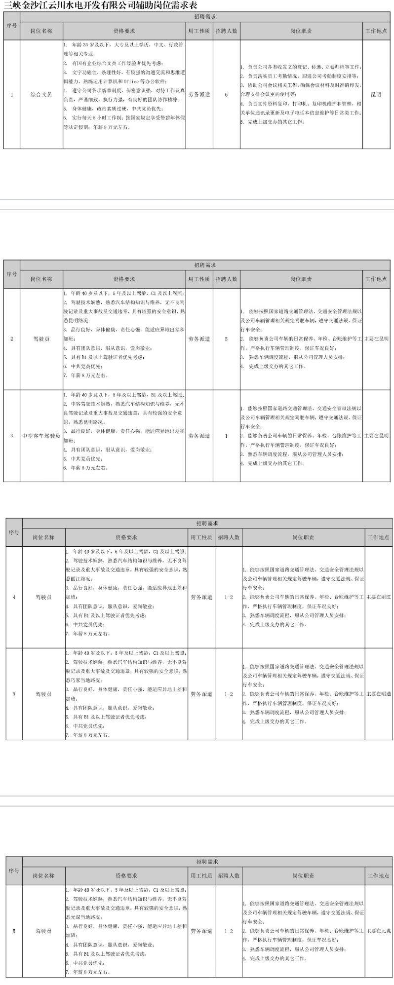 一、招聘崗位及要求(詳見(jiàn)三峽金沙江云川水電開發(fā)有限公司輔助崗位需求表)