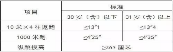 體能測試參照《公安機關(guān)錄用人民警察體能測評項目和標準(暫行)》進行。具體標準如下: