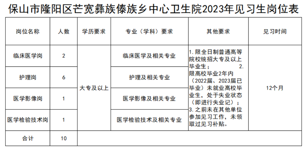 保山市隆陽(yáng)區(qū)芒寬彝族傣族鄉(xiāng)中心衛(wèi)生院2023年見(jiàn)習(xí)生崗位表 |