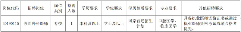 因工作需要,經(jīng)醫(yī)院研究同意在大理大學(xué)第一附屬醫(yī)院2019年公開招聘(第二批)編制外工作人員崗位計劃中增加“頜面外科醫(yī)師”崗位計劃1名,現(xiàn)補發(fā)公告,具體招聘崗位及條件如下: