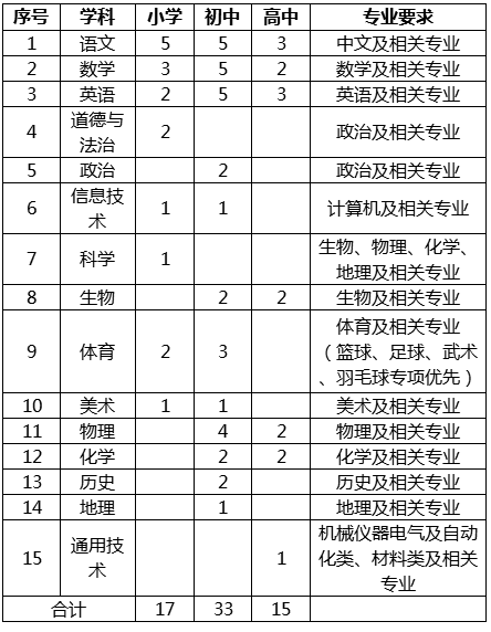 根據(jù)學(xué)校發(fā)展需要,決定面向社會(huì)公開(kāi)招聘小學(xué)、初中、高中各學(xué)科教師65名,現(xiàn)將相關(guān)事宜公告如下: