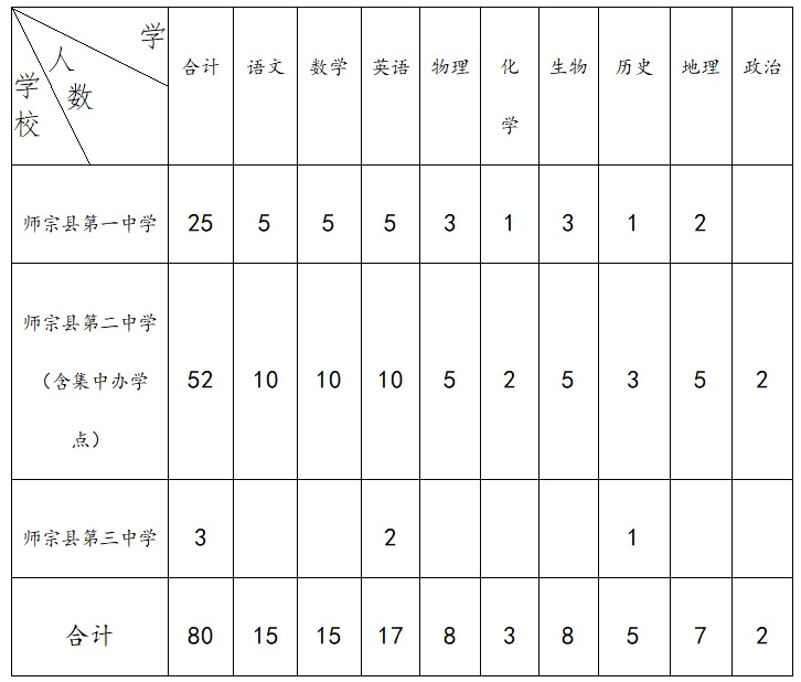 為加強師宗縣教師隊伍建設(shè),經(jīng)縣委、縣政府同意,曲靖市師宗縣教育體育局決定面向全國師范大學(xué)類本科大學(xué)(不包含師范類學(xué)院)(名單見附件1)2020年畢業(yè)的優(yōu)秀學(xué)生,公開招聘中學(xué)教師80名,現(xiàn)公告如下。